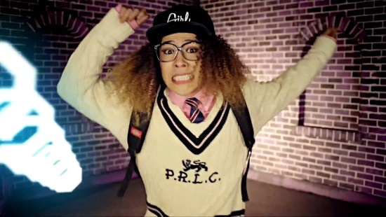 | Tạo hình "bà cô" với mái tóc xoăn như mì tôm trong MV Michigo. |