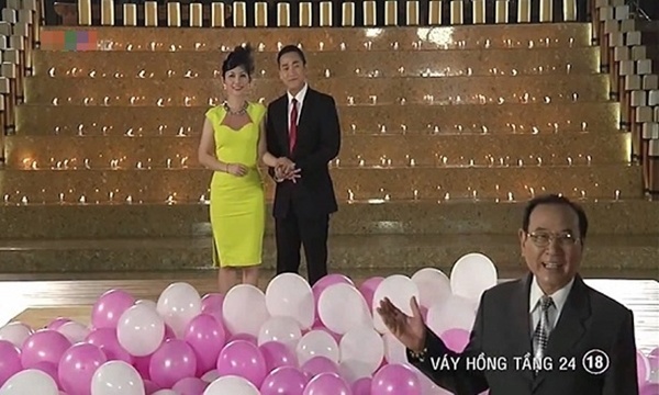 | Kim Hiền nắm chặt tay Hứa Vĩ Văn trong “đám cưới màn ảnh” của phim Váy hồng tầng 24. |