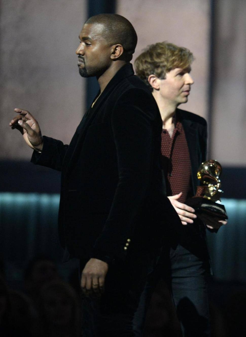 Kanye West diễn lại màn giật mic khi Beck nhận tượng vàng tại hạng mục Album của năm với Morning Phase - chiến thắng bất ngờ nhất Grammy năm nay. Đây chỉ là một trò đùa của nam rapper, nhưng chừng đó cũng đủ kiến rocker kỳ cựu Beck sững sờ trong giây lát.