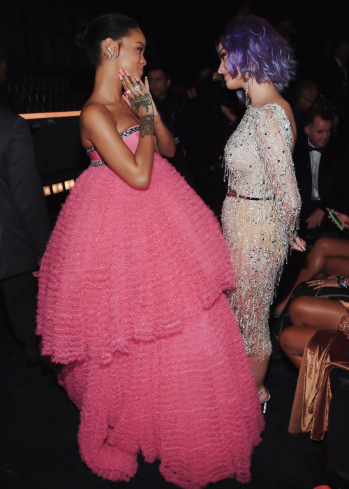 Hai cô bạn thân Rihanna và Katy Perry “tay bắt mặt mừng” tại Grammy 2015. Nếu như Riri diện chiếc váy đỏ hồng rực rỡ thì Katy cũng không chịu kém cạnh với mái tóc màu tím.