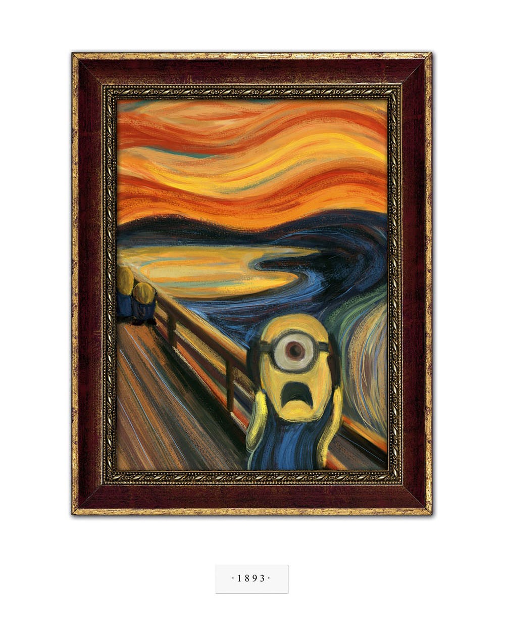 Minions: Không chỉ cố gắng thu hút sự chú ý từ trẻ nhỏ, bom tấn hoạt hình Minions còn muốn lôi kéo khán giả lớn tuổi tới rạp. Đó là lý do Illumination Entertainment tung ra loạt poster giễu nhại hàng loạt các tác phẩm nghệ thuật nổi tiếng trong lịch sử nhân loại. Chúng đồng thời minh họa cho chi tiết trong trailer, rằng các sinh vật tiểu quái da vàng đã xuất hiện suốt từ thời cổ đại cho tới tận ngày nay. |
