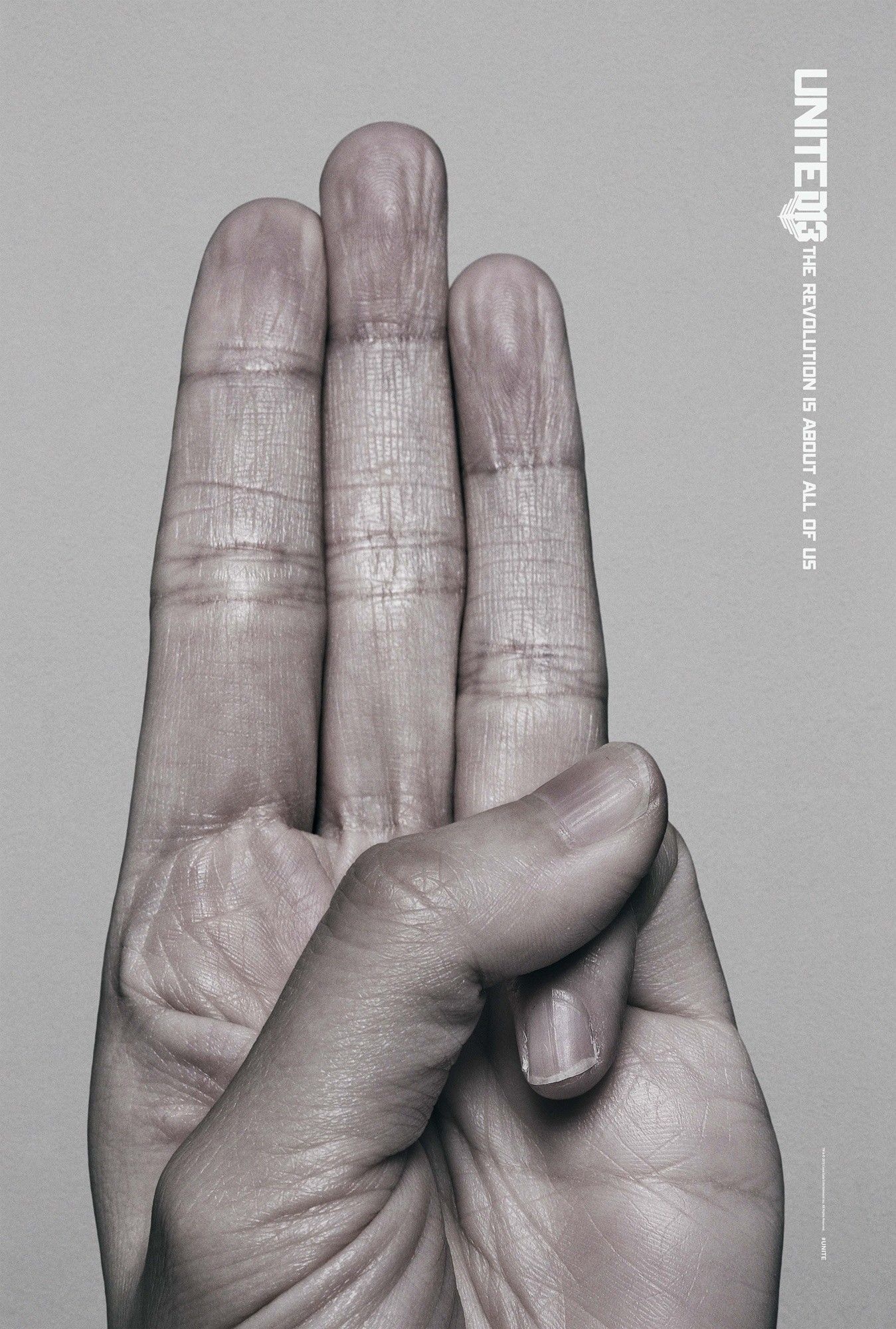 The Hunger Games: Mockingjay - Part 2: Tấm poster với hình Katniss Everdeen (Jennifer Lawrence) rất đẹp, nhưng có lẽ nó không thể gây ấn tượng bằng hình ảnh bàn tay với biểu tượng Húng Nhại. Đây chỉ là bức hình đơn giản, nhưng nó cho thấy sự đoàn kết của người dân 13 quận tại Panem trong cuộc nổi dậy chống lại chính phủ thối nát của Tổng thống Snow (Donald Sutherland). |