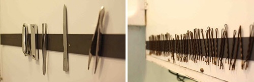 | 6. Dải nam châm dài đóng lên tường là nơi lưu giữ những chiếc ghim cài tóc và vật dụng nhỏ làm từ kim loại rất hữu ích. |
