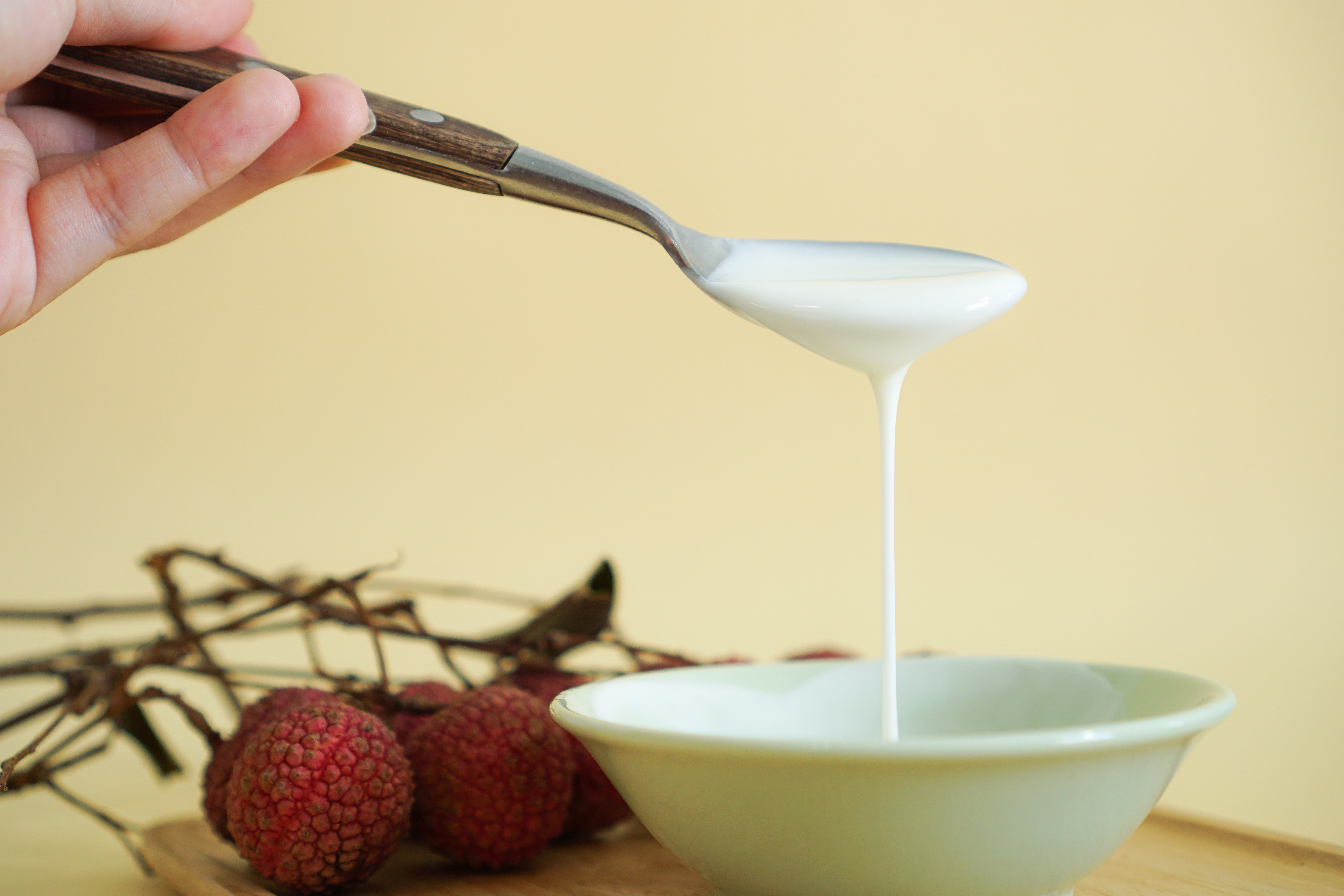 - Dùng thìa đổ sữa chua vào cơm vải. Múc một lượng vừa đủ để nhân không tràn ra ngoài.