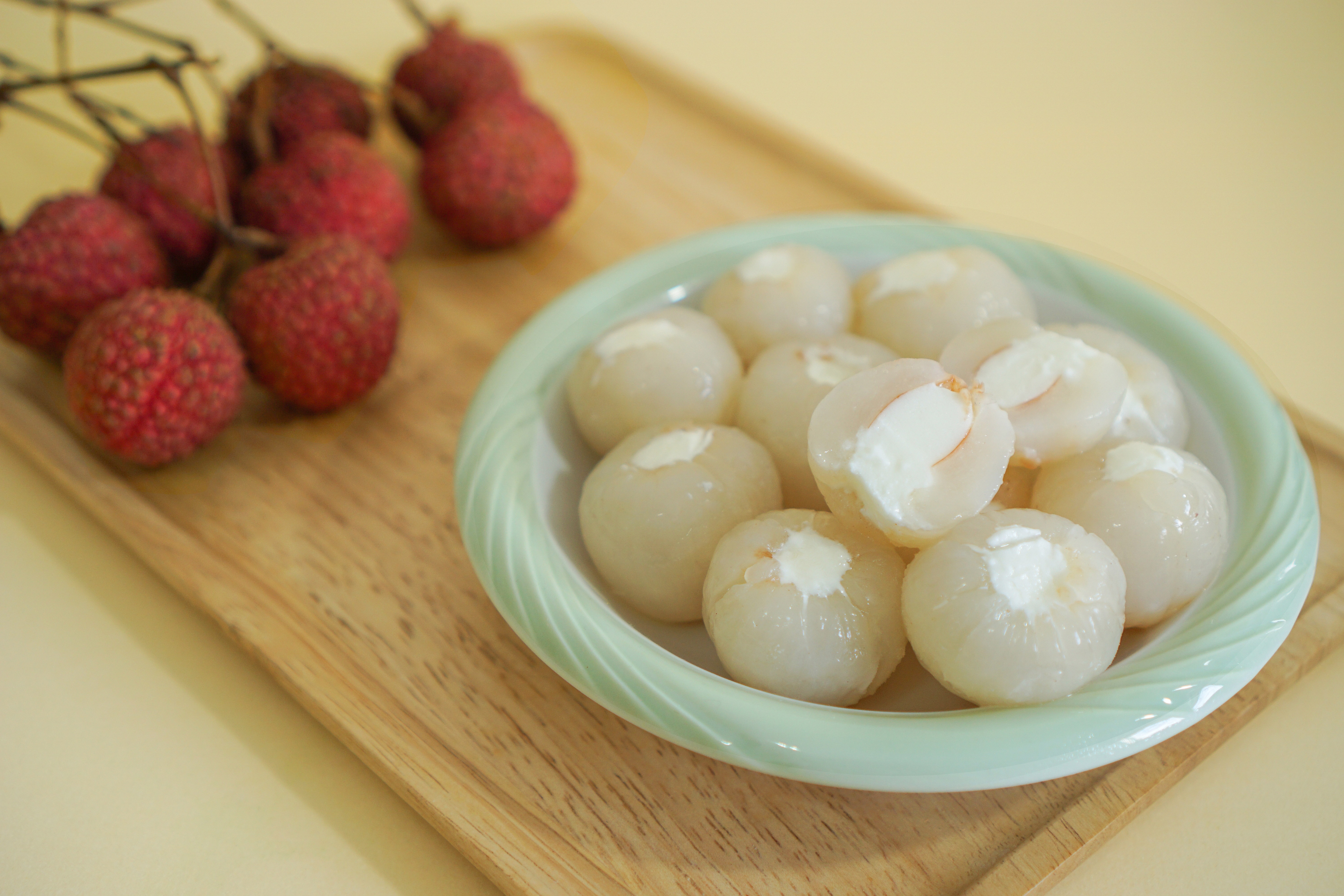 - Đầu tiên, rửa sạch vải rồi để ráo. Sau đó, lột 1/2 vỏ, dùng dao nhọn hoặc dụng dụng cụ gắp để tách bỏ hạt.