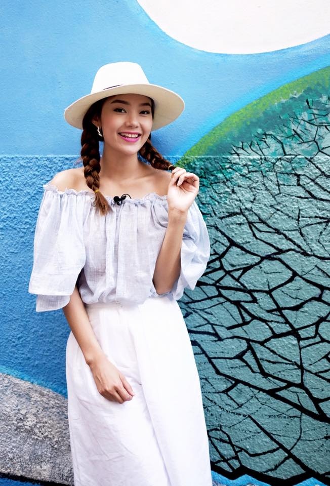 Áo trễ vai: Mốt áo này từng làm mưa làm gió trong dịp hè vừa qua. Với thời trang thu, Minh Hằng mix kèm với mốt quần culottes trắng để tạo nên một phong cách rất nữ tính.