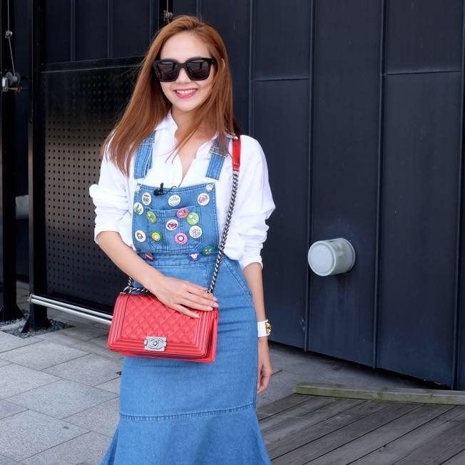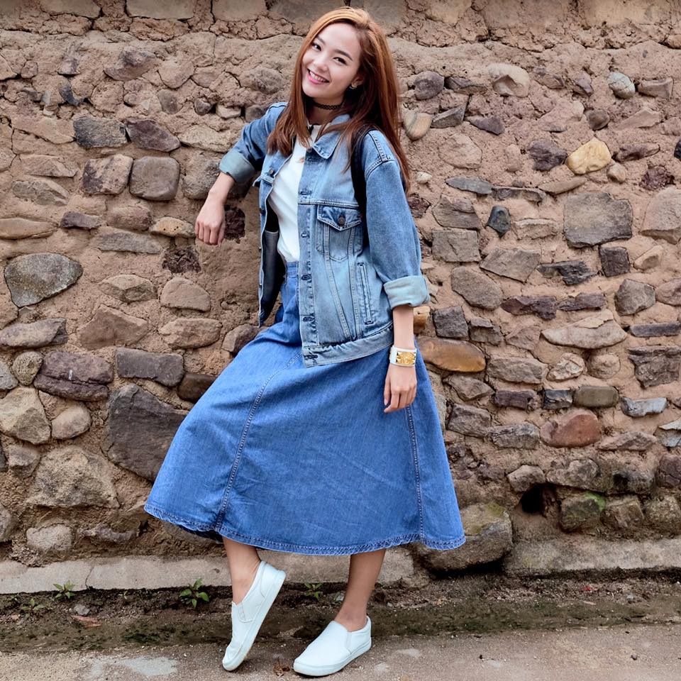Áo denim jaket: Nếu như mùa hè, mẫu áo khỏe khoắn này còn có tác dụng chống nắng thì sang mùa thu, đây là gợi ý hoàn hảo để mix với áo thun, váy denim như Minh Hằng.