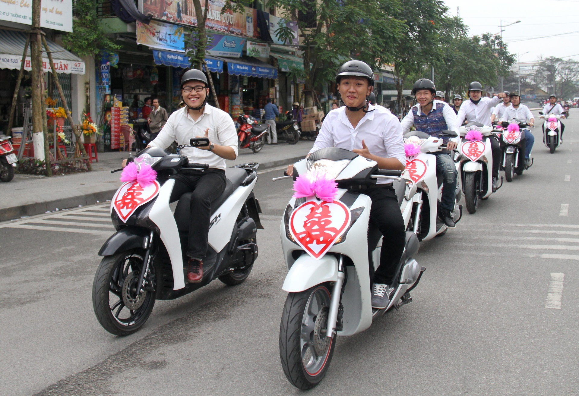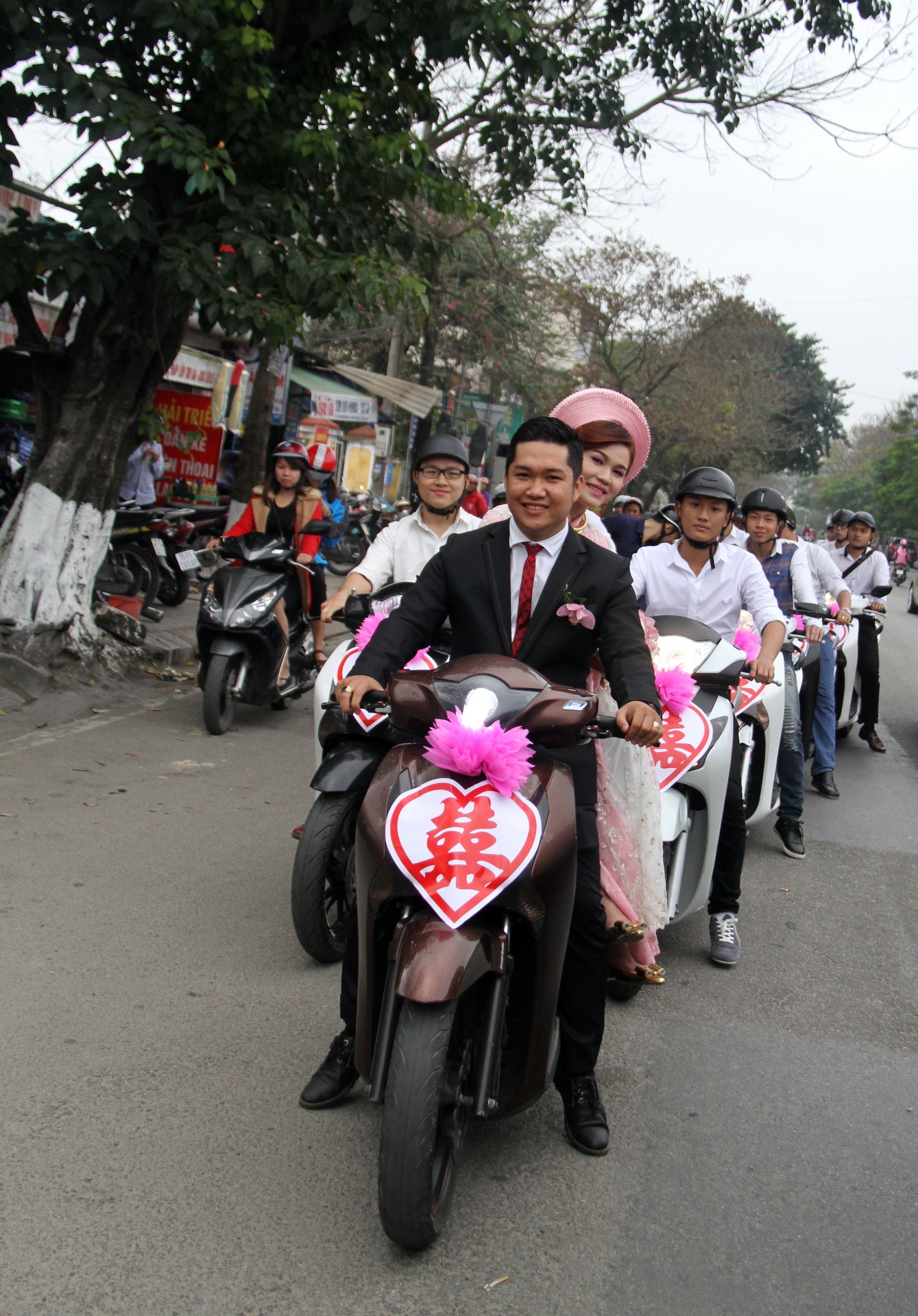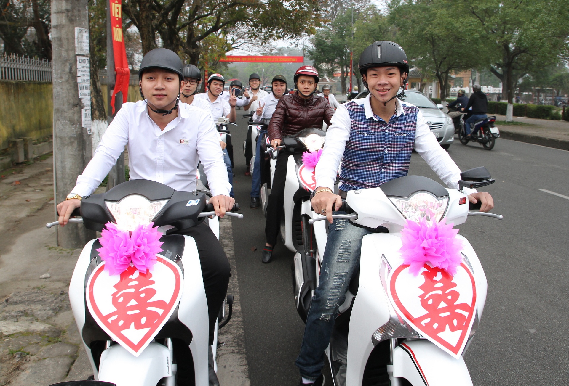 | Ngày 26/1, tại thành phố Huế đã diễn ra một đám rước dâu khá độc. Những người tham gia đều chạy xe SH, đa phần mang màu trắng. |