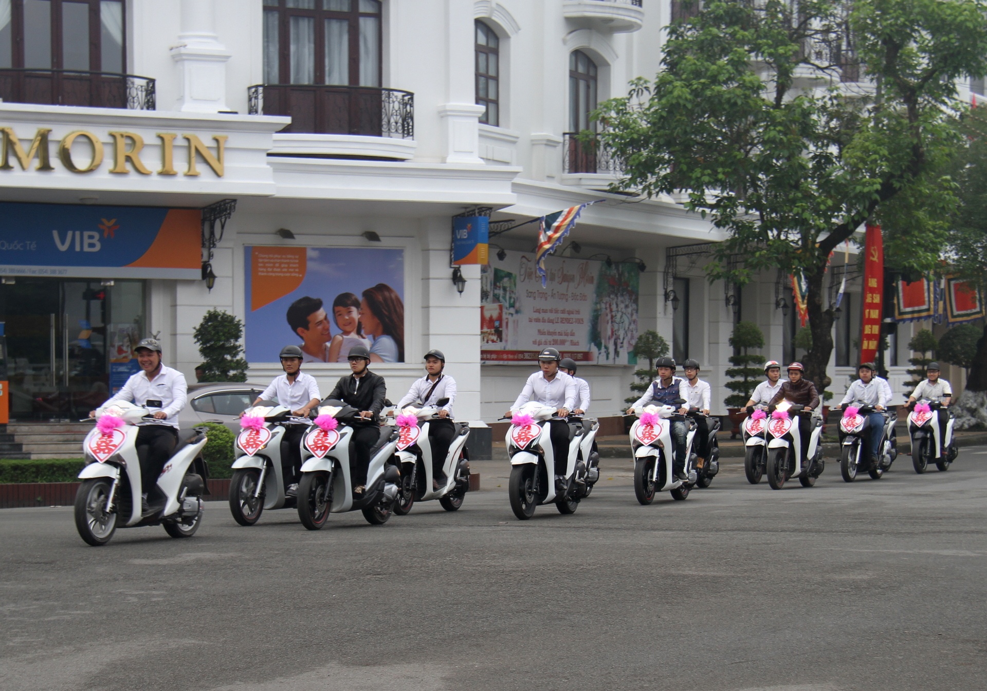 | Dẫn đầu đoàn xe là chú rể Tiến Vũ và cô dâu Thu Thảo. Tiến Vũ sinh năm 1990, hiện là chủ một tiệm kinh doanh. Thu Thảo sinh năm 1994, hiện là sinh viên sư phạm mầm non năm cuối. Chiếc xe của chú rể được trang bị nhiều món đồ chơi độc như gương cầu Mori, tay thắng Accel, hai đĩa Megapro, phuộc sau YSS G-Euro, ống pô SC - Project... |