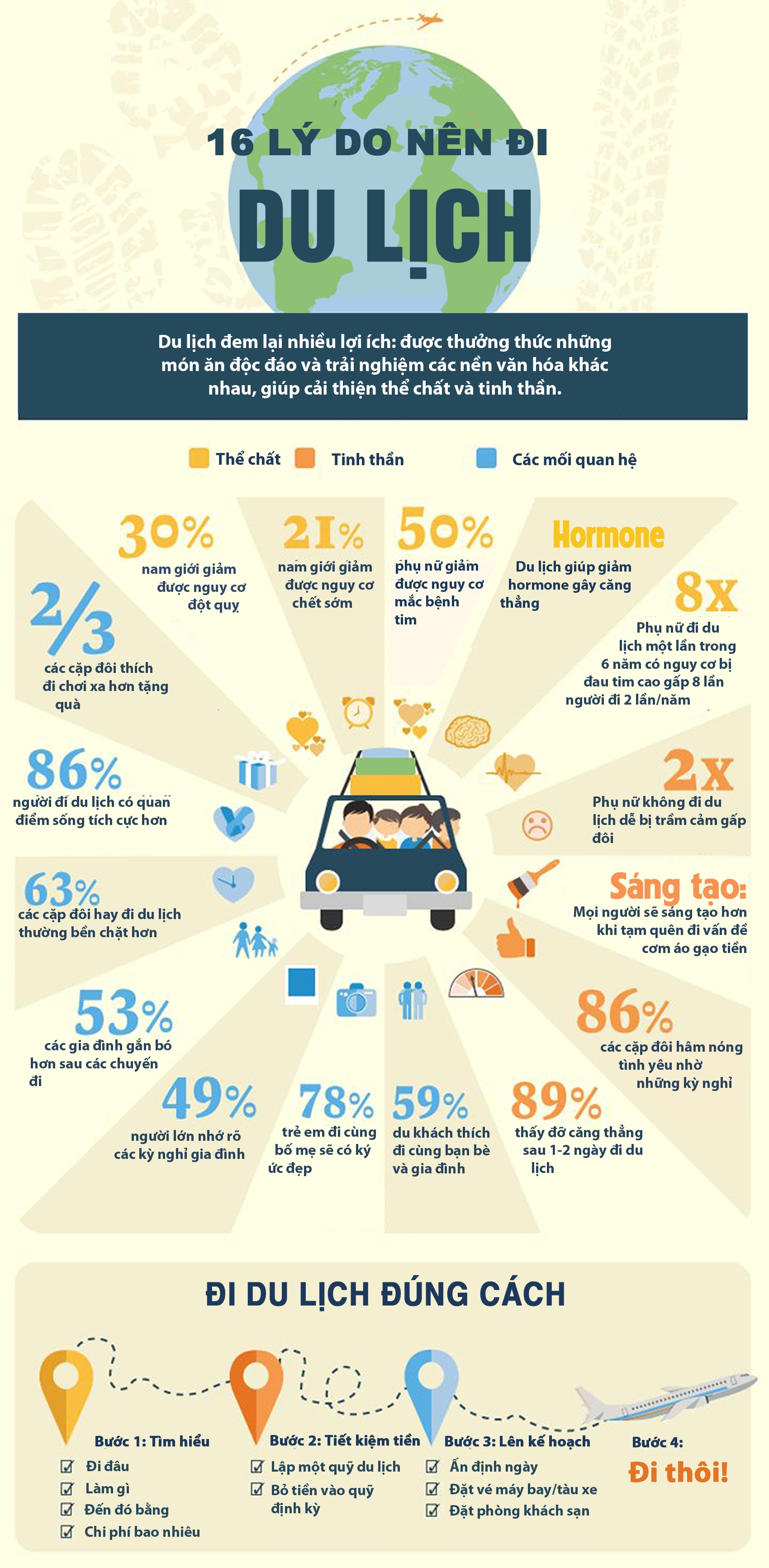 Du lịch đem lại nhiều lợi ích: được thưởng thức những món ăn độc đáo và trải nghiệm các nền văn hóa khác nhau, giúp cải thiện thể chất và tinh thần.
