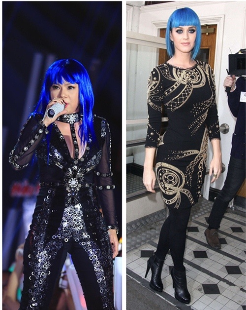 | Trong live show Dấu ấn, nữ ca sĩ Thanh Thảo bất ngờ xuất hiện với hình ảnh khác lạ nhằm tạo không khí trên sân khấu. Một số ý kiến cho rằng Búp bê đang cưa sừng làm nghé giống hình ảnh Katy Perry khi biểu diễn tại show Live Lounge Special. |