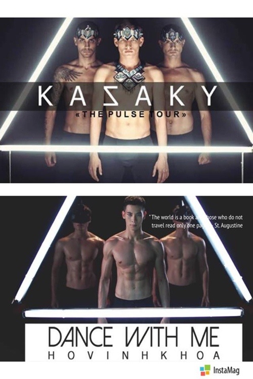 | Hình ảnh bán nude gợi cảm trên bìa single Dance with me của Hồ Vĩnh Khoa cùng 2 vũ công nam gây ấn tượng với nhiều người hâm mộ. Tuy nhiên, ảnh bìa này gần như sao y bản chính với ảnh quảng bá The pulse tour của nhóm nhảy nổi tiếng Kazyky. |