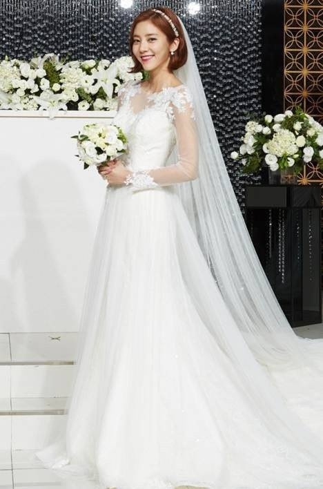 Ngoài 30 tuổi nhưng vẫn sở hữu gương mặt trẻ thơ, Jang Nara đầy tự tin khi mặc váy cưới. Vóc dáng mỏng manh, cô thường mặc váy cúp ngực dáng xòe bồng.