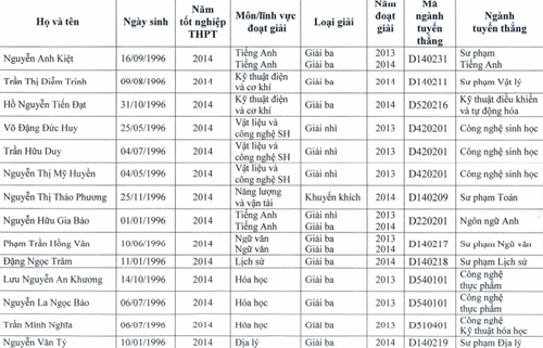Danh sách những thí sinh được tuyển thẳng vào trường cụ thể như sau: