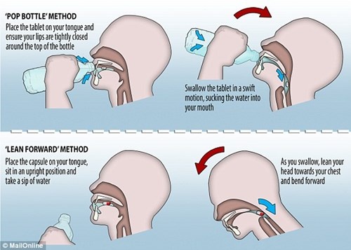 Đối với kĩ thuật “pop bottle”, bạn đặt thuốc viên trên lưỡi, môi ngậm quanh đầu chai nước và nuốt thật nhanh. Đối với kĩ thuật “lean forward”, thuốc con nhộng được đặt trên lưỡi, bạn ngồi thẳng và uống một ngụm nước. Khi nuốt thuốc thì nghiêng đầu về phía ngực.