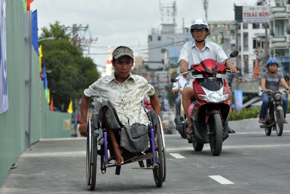 | Một người khuyết tật qua cầu Hậu Giang. |