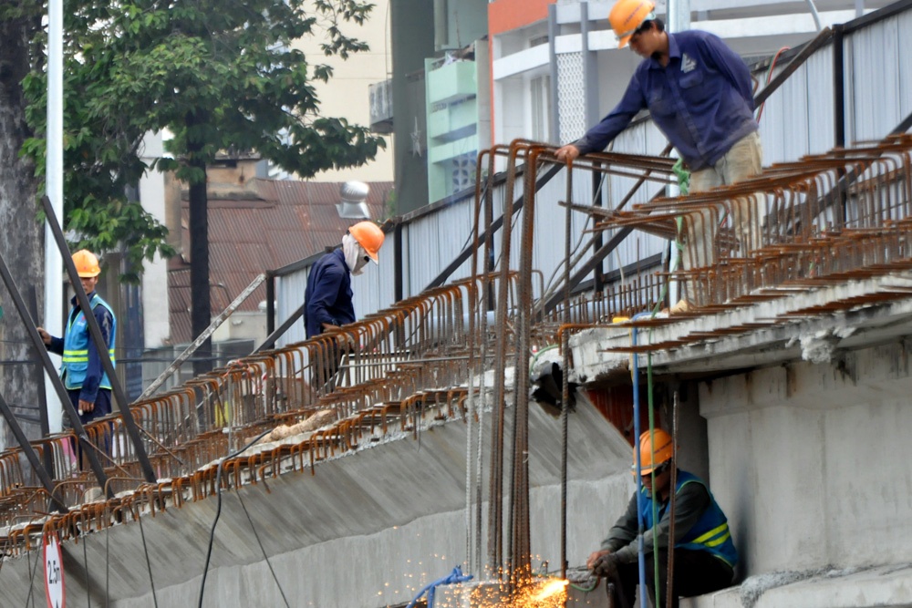 | Chủ thầu tiếp tục thi công phần thành cầu, kiến trúc để hoàn thiện cầu Bông. |