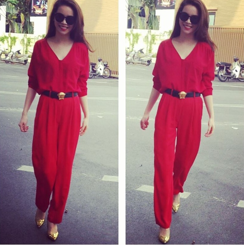 | Cô chọn thắt lưng Versace khi diện jumpsuit đỏ rực rỡ xuống phố. |