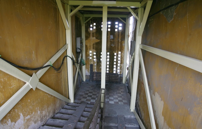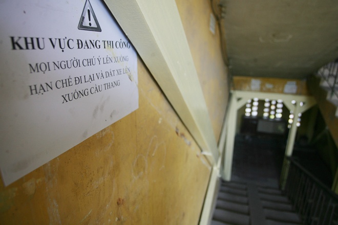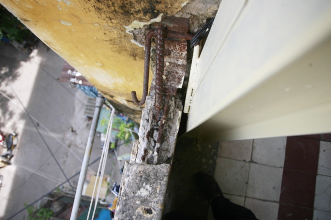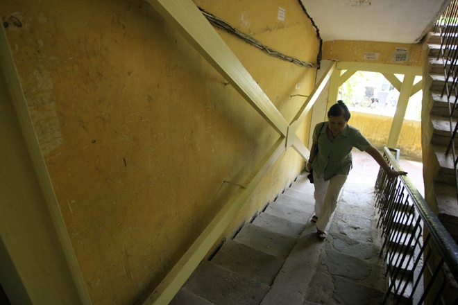 | Tuy nhiên những vết nứt, xô tường khiến ai chứng kiến cũng phải rùng mình. Nếu đứng từ cầu thang tầng 5 nhìn xuống sẽ dễ dàng thấy các khe hở rộng, thậm chí để lộ ra đoạn sắt gỉ. |