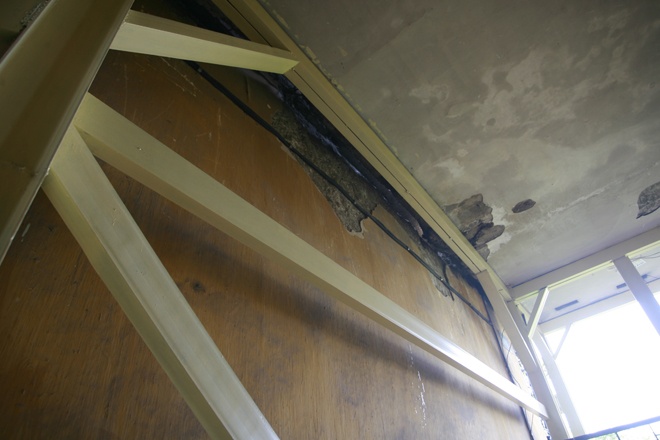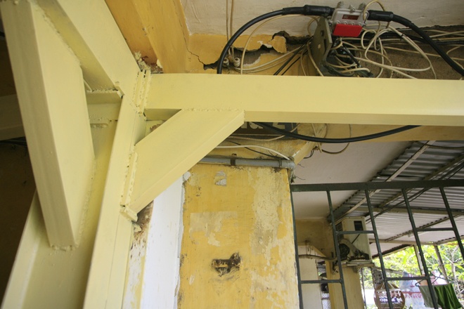 | Các dầm chịu lực từ tầng 1 đến tầng 5 của khu tập thể C8 Giảng Võ và gầm cầu thang đã tách khỏi tường, vết nứt theo chiều ngang dài 5-7cm. Cơ quan chức năng dùng giá đỡ bằng khung sắt, tuy nhiên những vết nứt không được gia cố. |