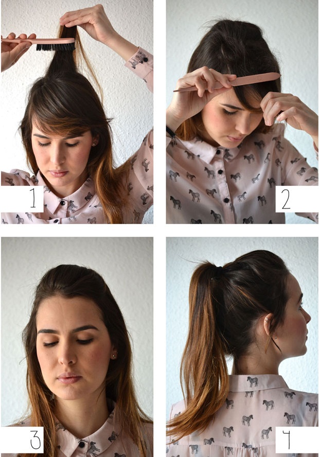 | Sử dụng lược làm phồng phần tóc mái, kẹp cố định, sau đó buộc cao tóc lên. |