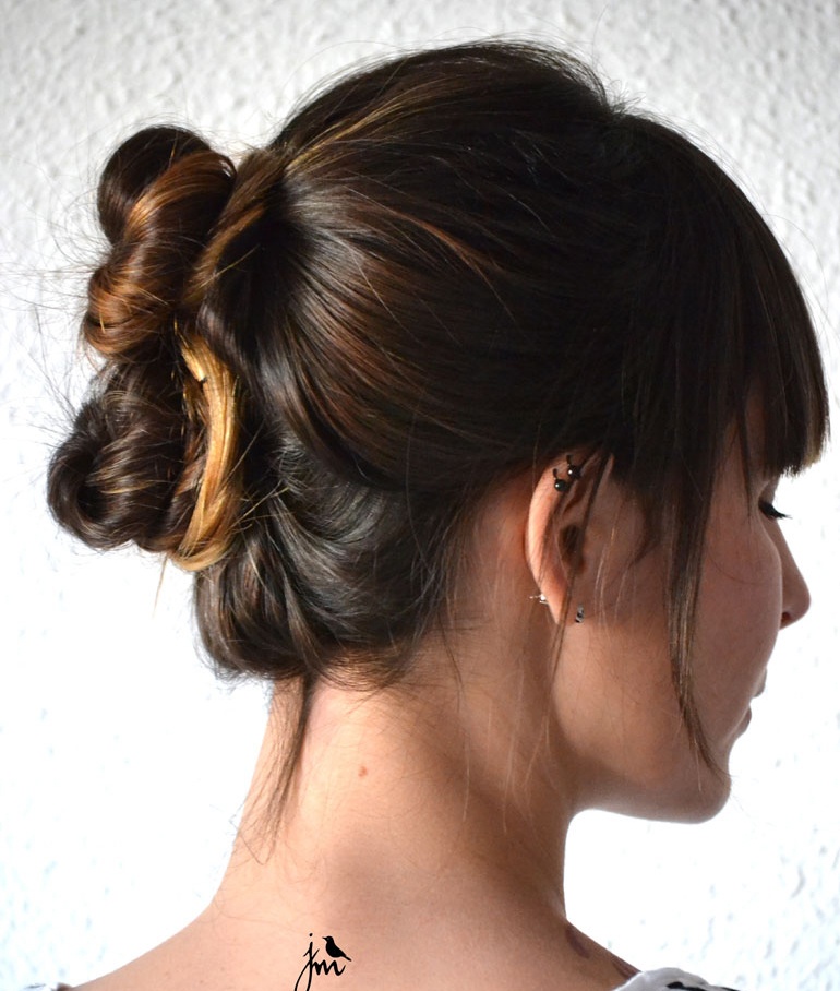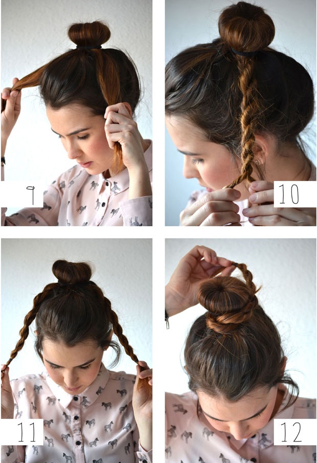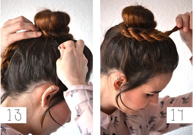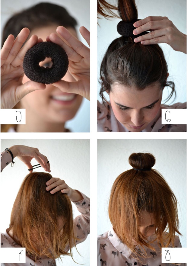 | Sử dụng một miếng mút để tạo hình nút búi, lồng mút vào tóc, sử dụng dây thun để giữ mút và tóc lại thành một búi trên đỉnh. |