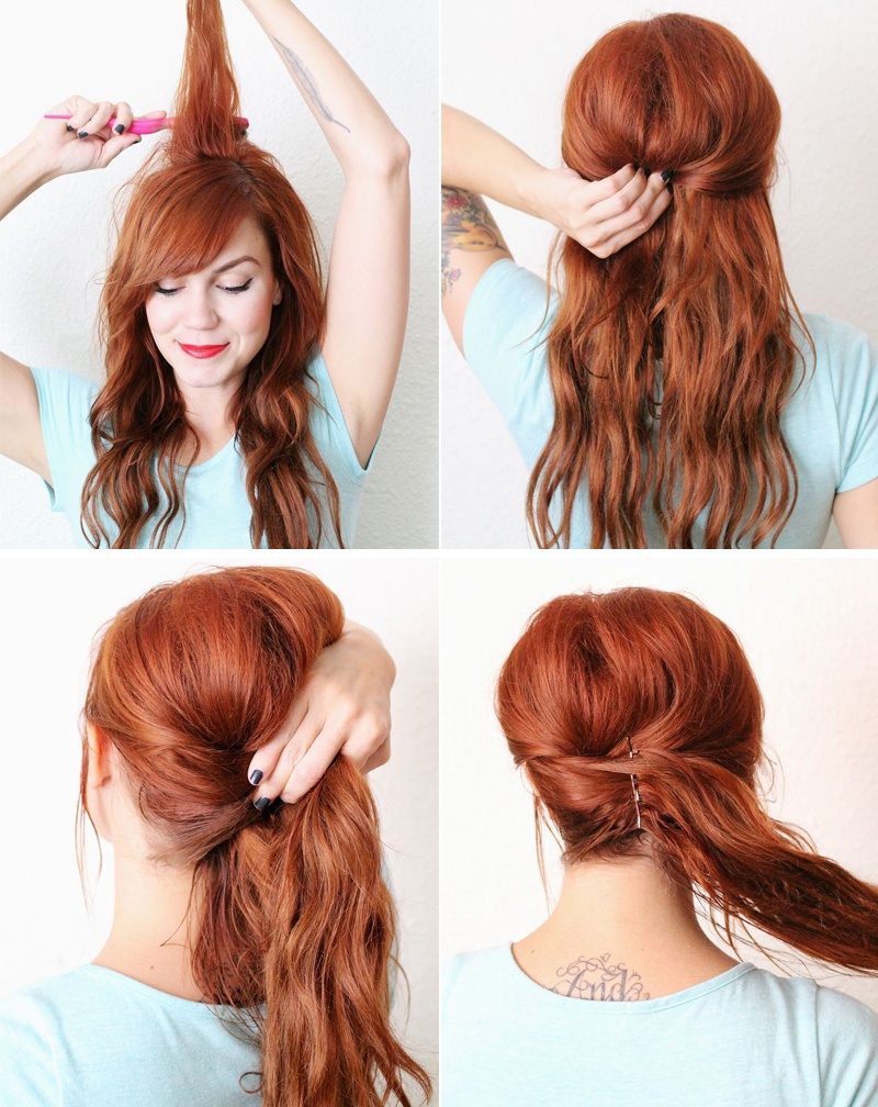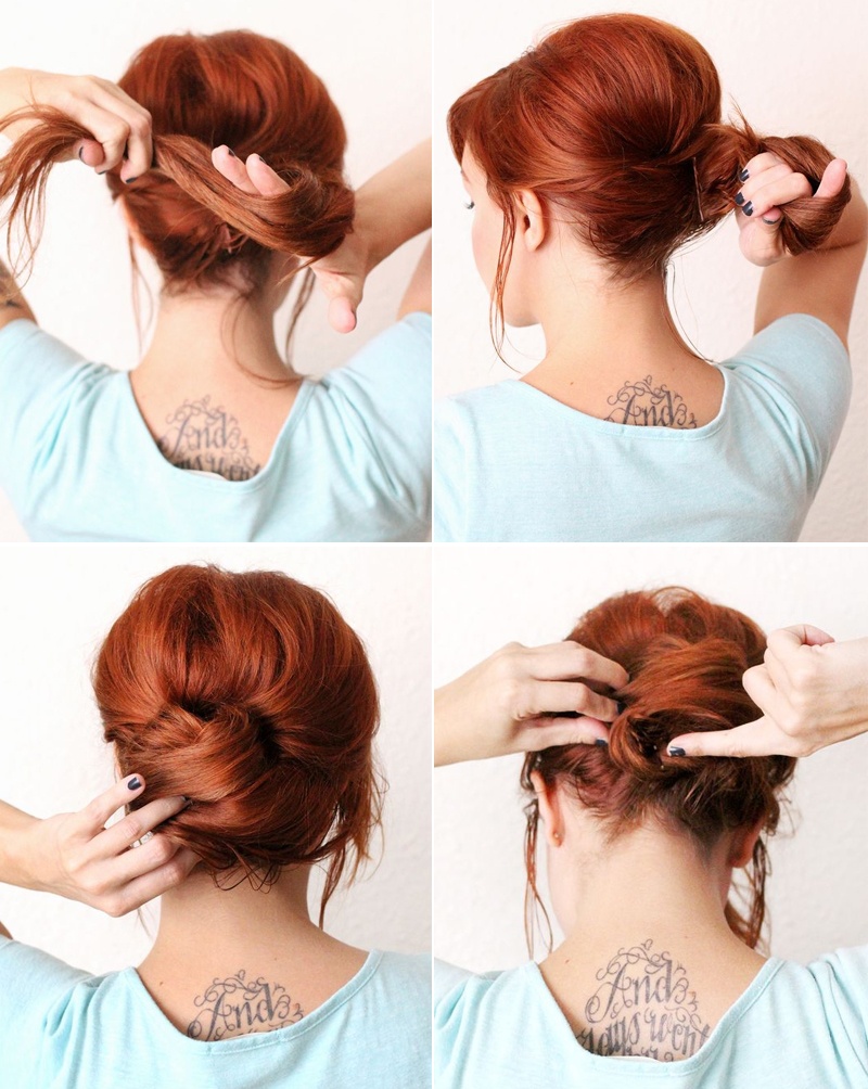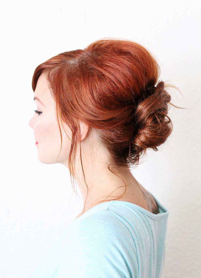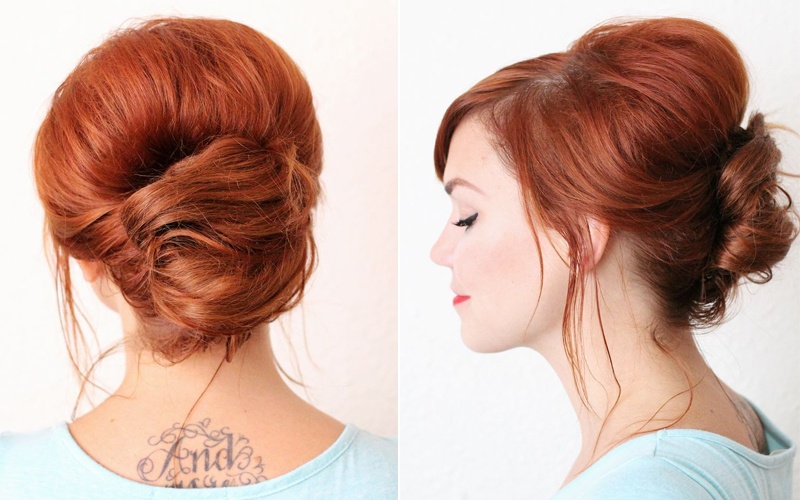 | Trước tiên bạn dùng lược đánh rối phần đỉnh để tạo độ phồng, sau đó buộc đuôi gà sau gáy. Phần đuôi tóc bạn xoắn thật chặt thay và vấn tròn lại tạo thành một nút búi. |