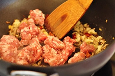 | Làm nóng chảo với một ít dầu ăn, cho gừng, tỏi, ớt, tiêu vào phi cho thơm, sau đó cho thịt heo xay vào xào. |
