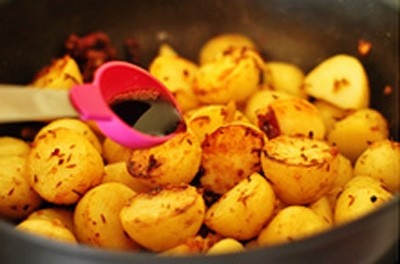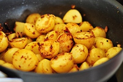 | Nấu đến khi khoai mềm (chừng vài phút) và phần nước trong chảo hơi keo lại. |