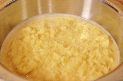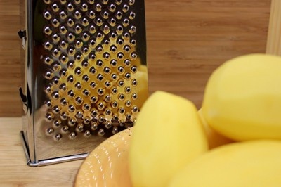 | Cho khoai tây vào máy xay thực phẩm, sau đó bạn lọc bỏ phần nước. |