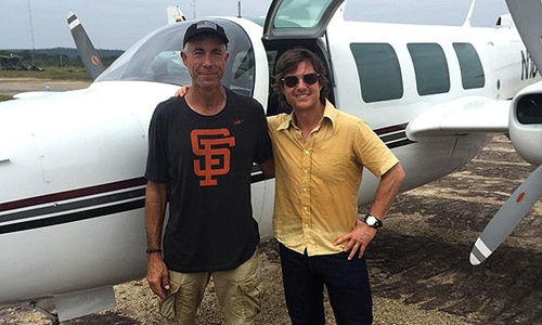 | Tom Cruise bên cạnh phi công Alan David Purwin trên trường quay của Mena. |