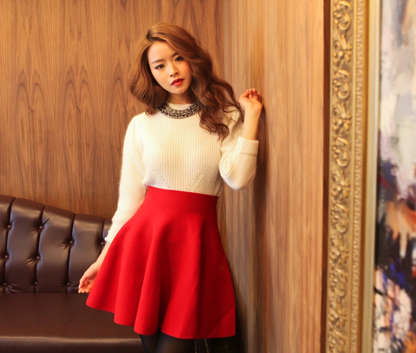| Đầm xòe cũng được bạn gái rất ưa thích. Đi kèm với tông đỏ là chiếc áo len trắng sẽ giúp bạn thêm trẻ trung. |