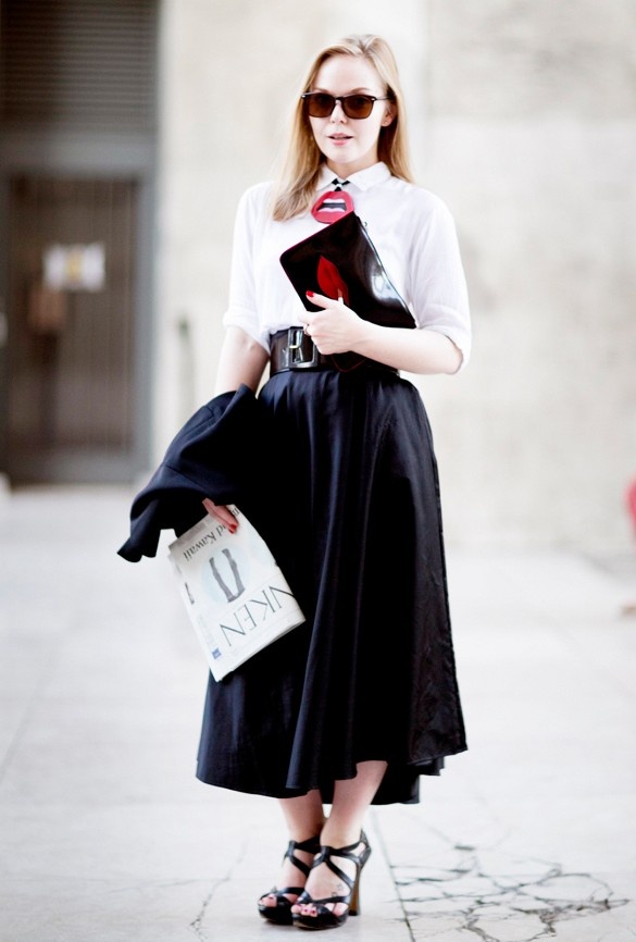 | Nếu bạn sở hữu đôi chân không đẹp thì thật may mắn vì váy midi vẫn có thể giúp bạn nhỏ gọn khi kết hợp cùng một đôi giày cao và sử dụng thắt lưng cao, gọn gàng. |
