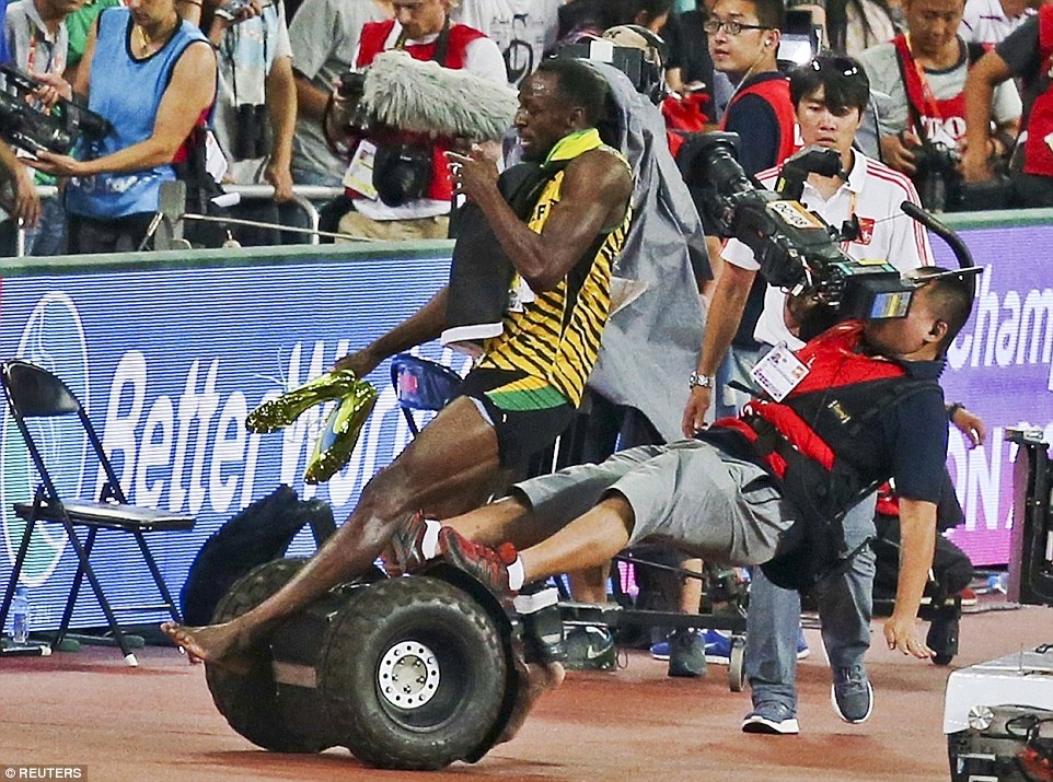 Sau khi giành HCV nội dung chạy 200 m tại giải điền kinh thế giới diễn ra ở Bắc Kinh, Trung Quốc ngày 26/8, Usain Bolt bị ngã khi chiếc xe điện của nhân viên quay phim có tên Tao Song va phải. (Xem chi tiết)