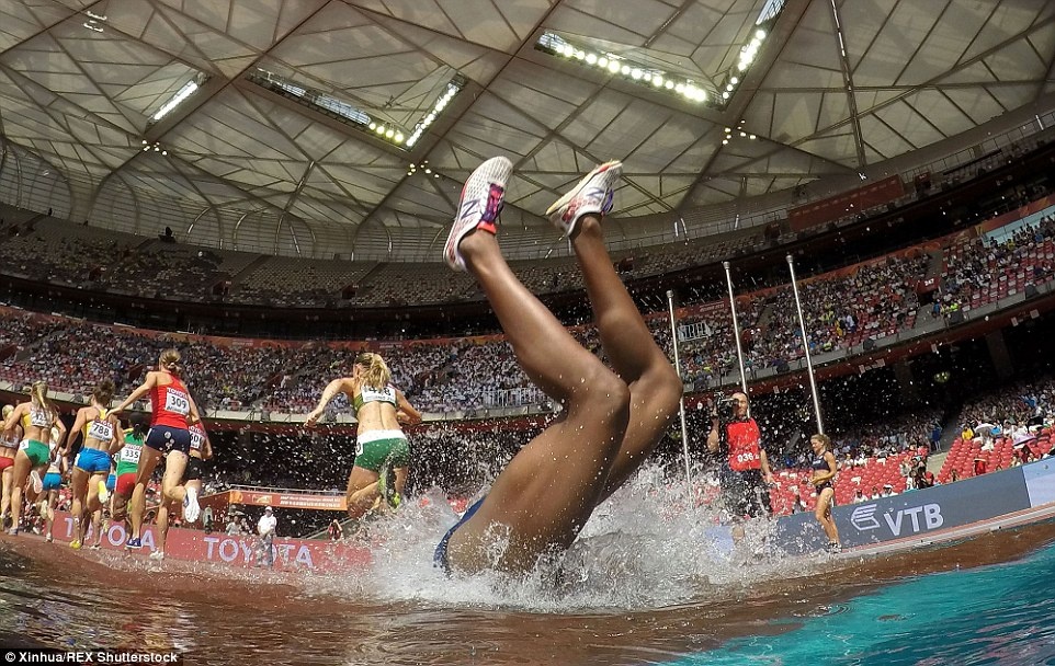 Nữ vận động viên người Panama, Rolanda Bell bị ngã xuống hố nước ở vòng loại nội dung chạy 3.000 m vượt chướng ngại vật tại giải VĐTG đang diễn ra ở Bắc Kinh, Trung Quốc ngày 25/8. (Xem chi tiết)