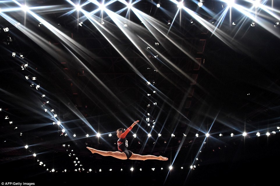 Vận động viên Aiko Sugihara người Nhật Bản thực hiện phần thi dưới ánh đèn lấp lánh tại giải Vô địch thế giới thể dục dụng cụ hồi tháng 10 ở Glasgow, Scotland.