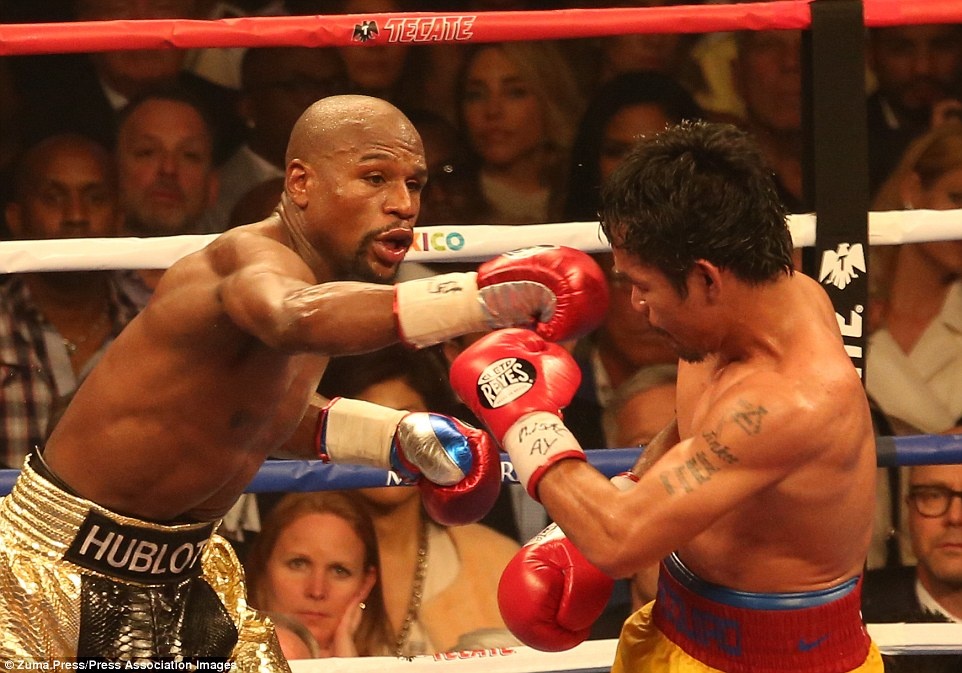 Võ sĩ người Mỹ Floyd Mayweather tung đòn về phía đối thủ người Philippines Manny Pacquiao trong cuộc so găng lịch sử tại đấu trường MGM Grand Garden Arena ở Las Vegas, Nevada (Mỹ) hồi tháng 5.