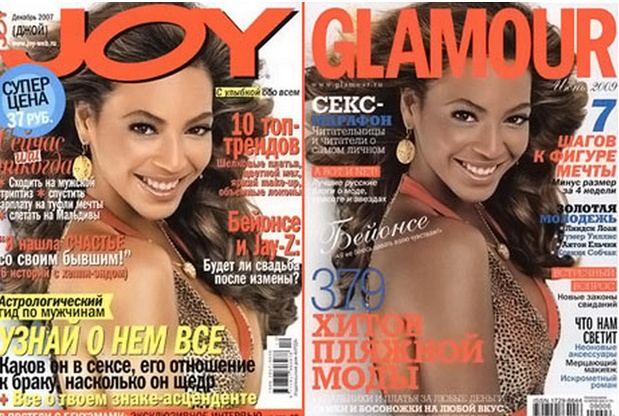 Trước đó, cô cũng gặp sự cố với cả hai tạp chí của Nga là Joy và Glamour khi cùng đăng một bức hình nhưng với màu sắc làn da và gương mặt hoàn toàn khác nhau.
