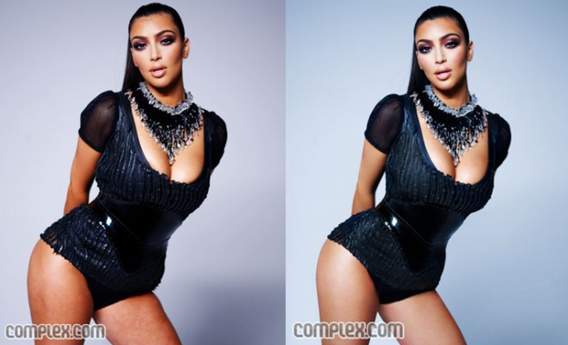 Tạp chí Complex đã nhầm lẫn đăng một hình ảnh chưa sửa lại của Kim trên trang web sau một buổi chụp hình với cô. Kết quả là ai cũng có thể nhận ra cô đã phải sử dụng thủ thuật làm gọn eo và vòng đùi nhiều như thế nào.