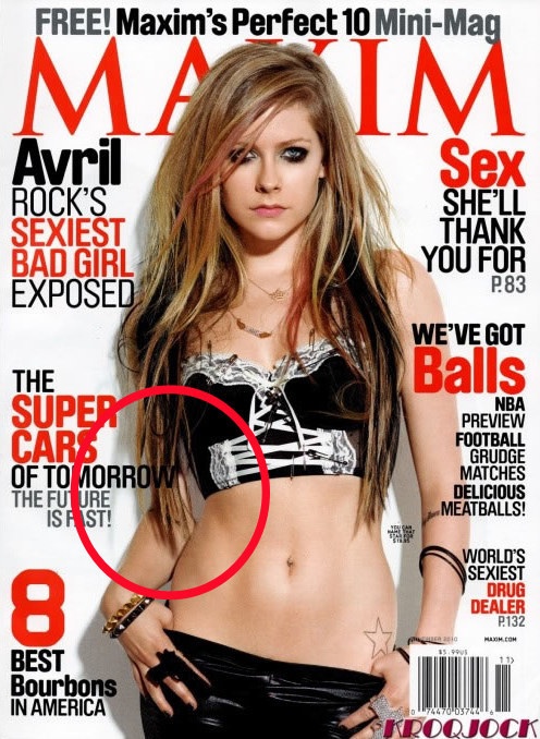 Trên trang bìa tạp chí Maxim, Avirl thậm chí đã mất luôn một phần cánh tay chỉ vì thao tác chỉnh eo của thợ ảnh.