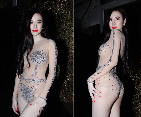 Với gu thời trang táo bạo và nóng bỏng không giới hạn, Angela Phương Trinh hiển nhiên có mặt trong danh sách người đẹp mặc phản cảm nhất năm 2013. Trong năm qua, không chỉ gây ồn ào về học vấn, yêu đại gia, phát ngôn gây sốc... nữ diễn viên còn khiến khán giả bội thực bởi gu thời trang phong cách Can Lộ Lộ. Trong một dịp diễn quán bar, ''bà mẹ nhí'' không ngại diện một mẫu jumpsuit thiết kế xuyên thấu bằng chất vải màu nude đính đá che chắn vùng nhạy cảm. Ngay sau hôm diễn, những hình ảnh này được đăng tải rộng rãi trên truyền thông khiến cô hứng chịu không ít búa rìu dư luận. Ảnh: Zing