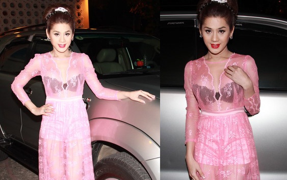 Mác ăn mặc sến, quê mùa gắn liền với Lâm Chí Khanh từ thời điểm tái xuất làng giải trí vào cuối năm 2012 cho đến thời điểm này. Sau một năm tạo dựng hình ảnh, gu thời trang của nữ ca sĩ chuyển giới vẫn không có sự tiến bộ. Cô luôn đứng đầu danh sách ăn mặc màu mè nhất showbiz Việt. Bộ cánh tông màu hồng toàn tập để lộ nội y nhận được phản ánh không mấy tích cực từ người xem. Sau đó người đẹp còn liêp tiếp xuất hiện với trang phục có hơi hướng công chúa, Hoàng gia rườm rà. Ảnh: Xzone