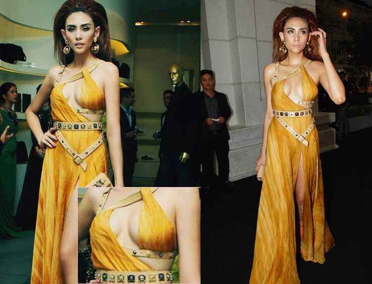 Diện một bộ váy nằm trong BST mùa hè 2013 của Versace, Hoàng Yến tự tin tại một sự kiện khai trương nhãn hàng. Tuy nhiên, bộ cánh hàng hiệu sang trọng lại không phù hợp với cách trang điểm cũng như vóc dáng của nữ người mẫu. Ảnh: Khám phá