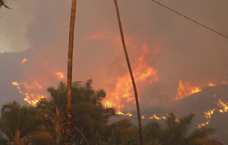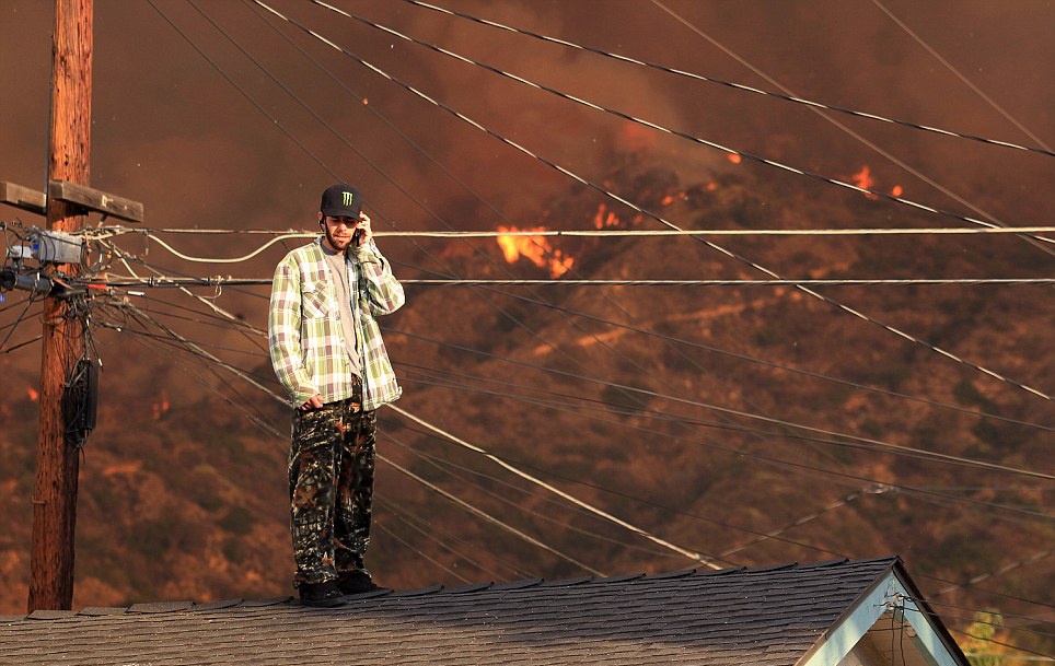 | Người dân gọi điện báo cho người thân. Hơn 2.000 người phải sơ tán vì vụ cháy. Ảnh: AP. |