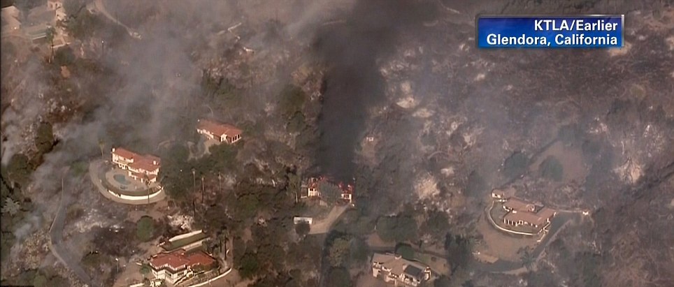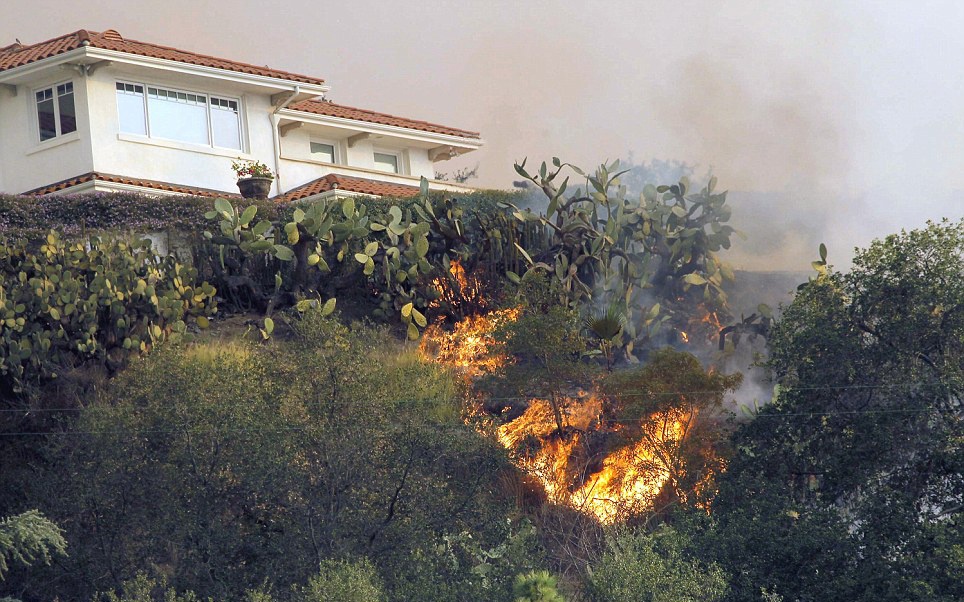 | Lửa đang lan tới một ngôi nhà trên đồi ở phía bắc thung lũng San Gabriel ở Glendora. Ảnh: AP. |