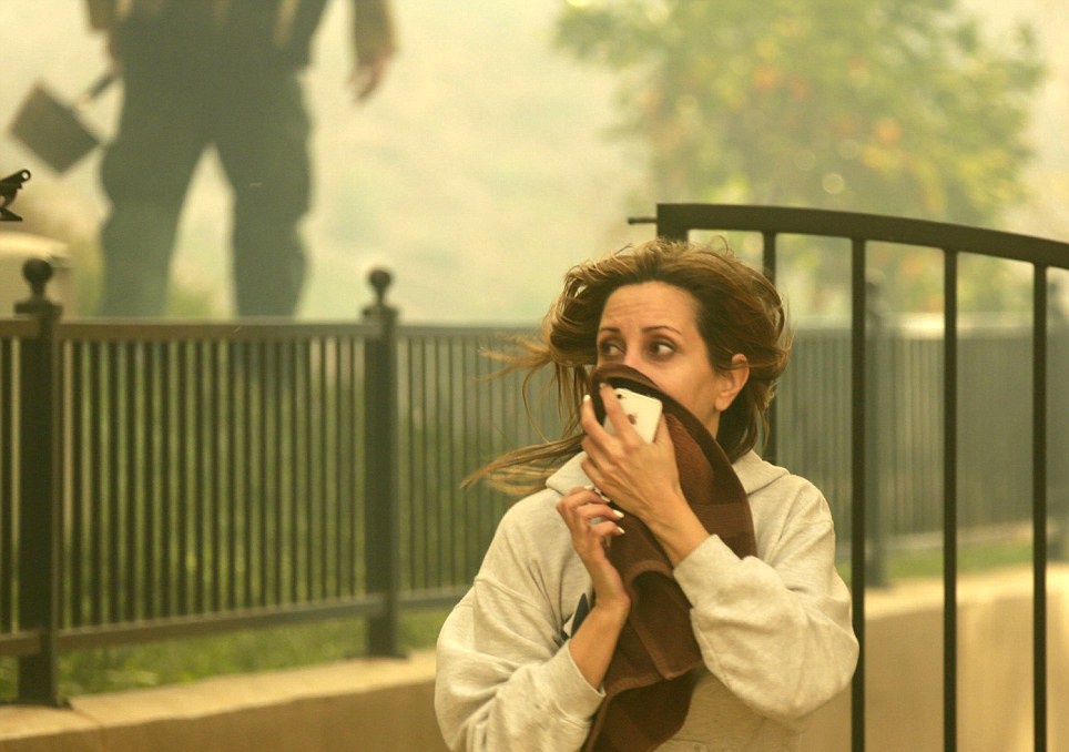 | Một phụ nữ bịt mũi vì khói dày dặc khi ngọn lửa đang tiến tới nhà cô tại Glendora, bang California. Ảnh: MCT. |