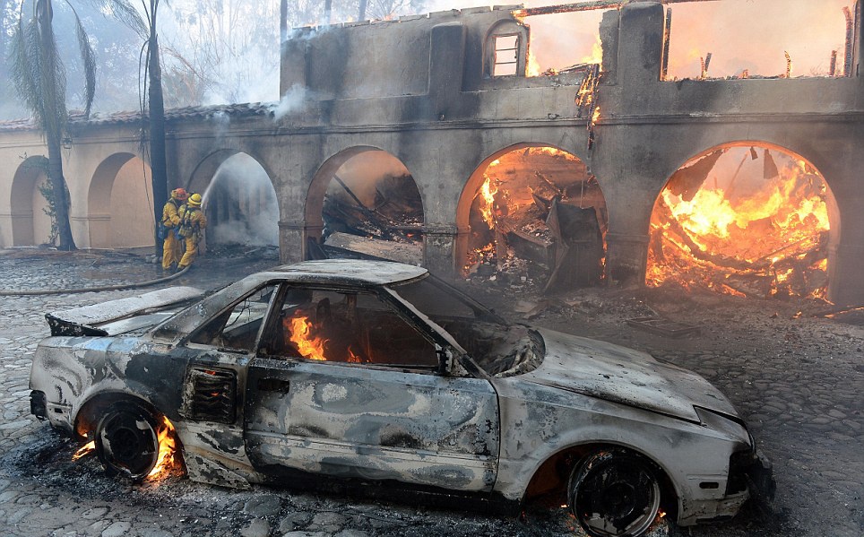 | Ô tô và công trình cháy rụi ở Glendora, California. Ảnh: AP. |