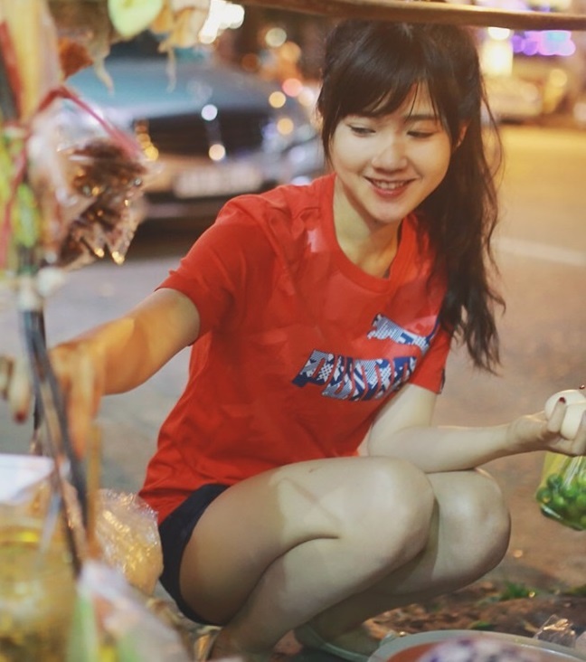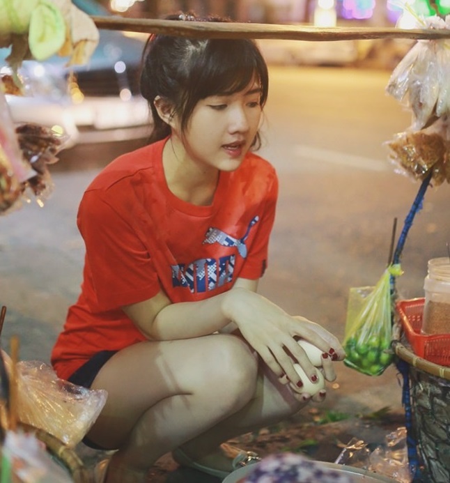 Trong ảnh, cô gái thu hút bởi vẻ ngoài xinh xắn, nụ cười tươi, diện áo thun đỏ, quần short đơn giản ngồi mua đồ ăn vặt. Các khoảnh khắc này nhanh chóng thu hút được sự chú ý của cộng đồng mạng với hơn 200.000 lượt xem, 30.000 lượt chia sẻ, cùng hàng trăm bình luận sôi nổi về nhan sắc của cô gái này.