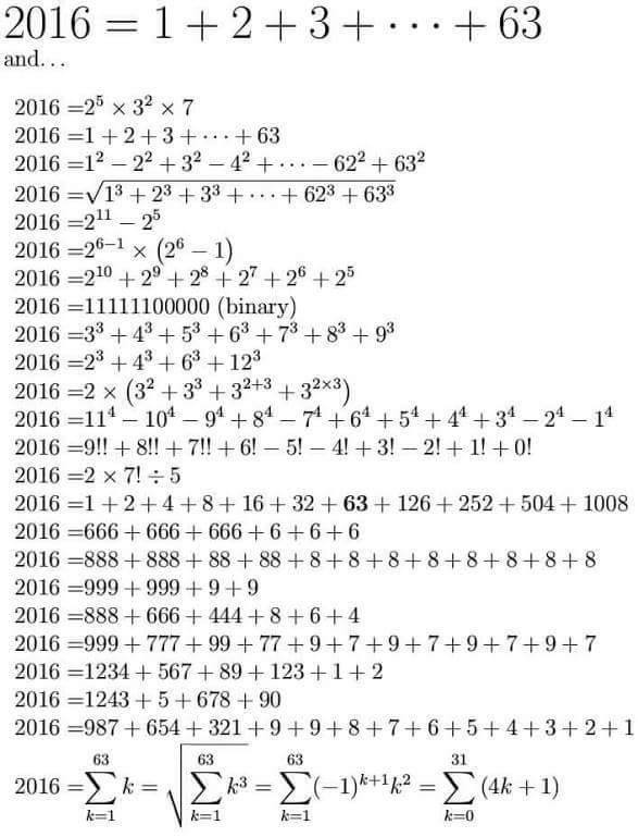 Có rất nhiều phép toán thú vị được diễn giải từ con số 2016. Ví dụ, tổng của dãy số liên tiếp từ 1 đến 63 = 2016, hay 2016 = 666 + 666 + 666 + 6 + 6 + 6