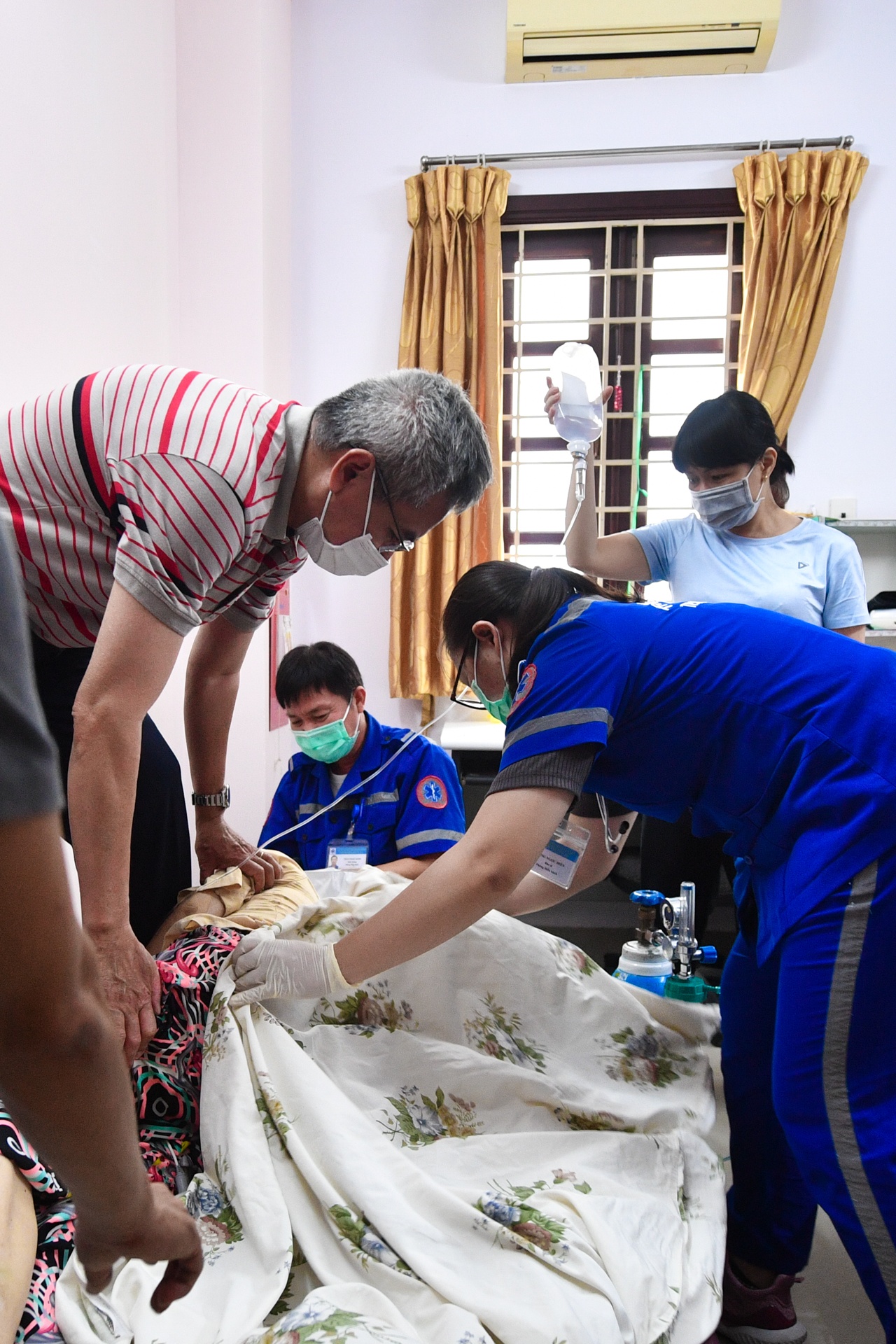 | Nghe nhịp tim đập yếu, chúng tôi đo điện tim để có thêm thông tin chính xác về tình trạng hiện tại của bệnh nhân. Bà cụ bị tụt huyết áp và suy hô hấp. Tôi lập tức lắp bình thở oxy cho bà trước khi đưa tới bệnh viện gần nhất. |